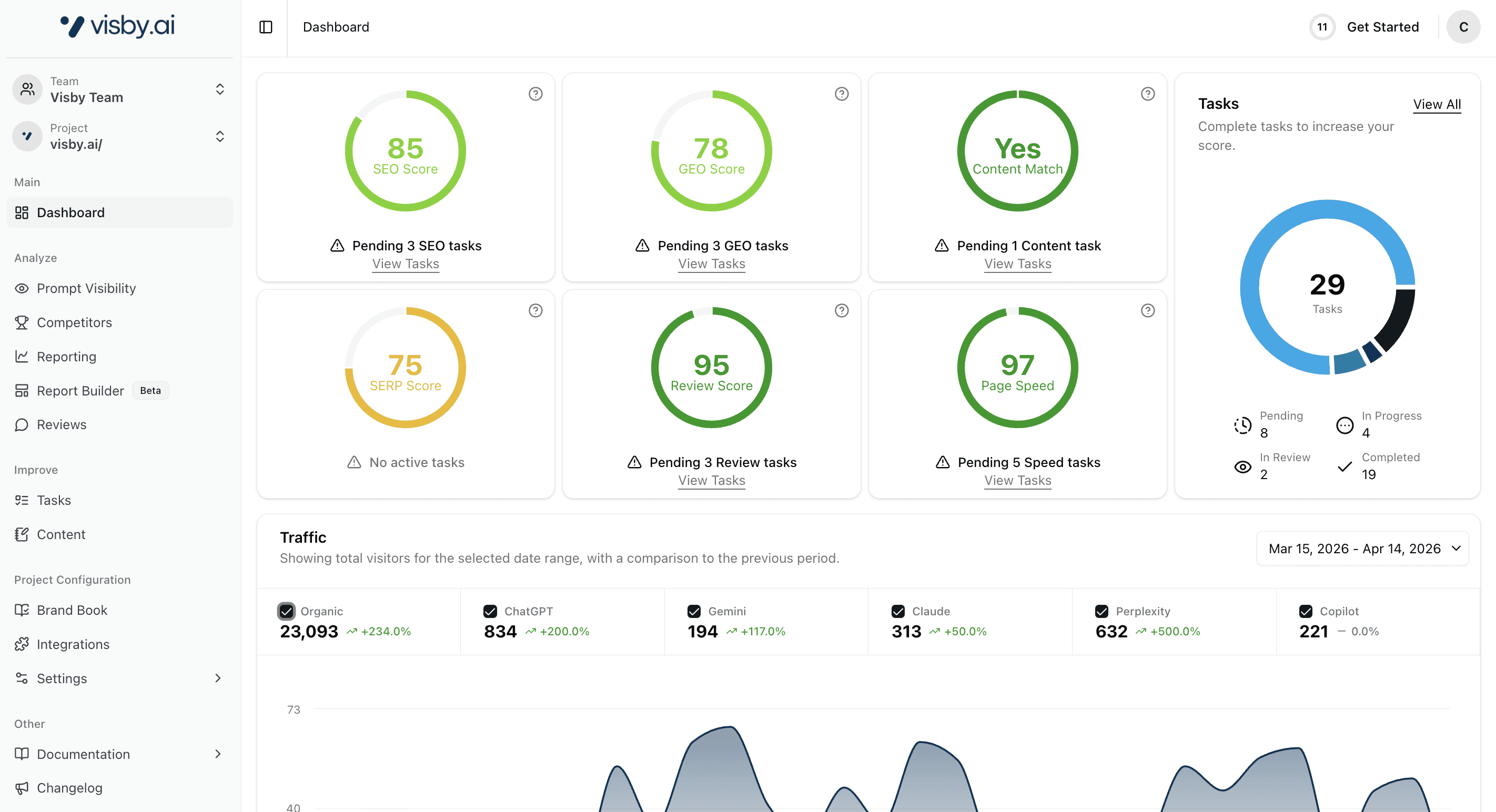 GEO (Generative Engine Optimization) tasks are personalized, actionable recommendations Visby generates based on your visibility data. Unlike traditional analytics tools that just show metrics, Visby analyzes your performance gaps and creates specific tasks - from content optimization to technical fixes - prioritized by potential impact. Each task includes clear instructions and expected outcomes.