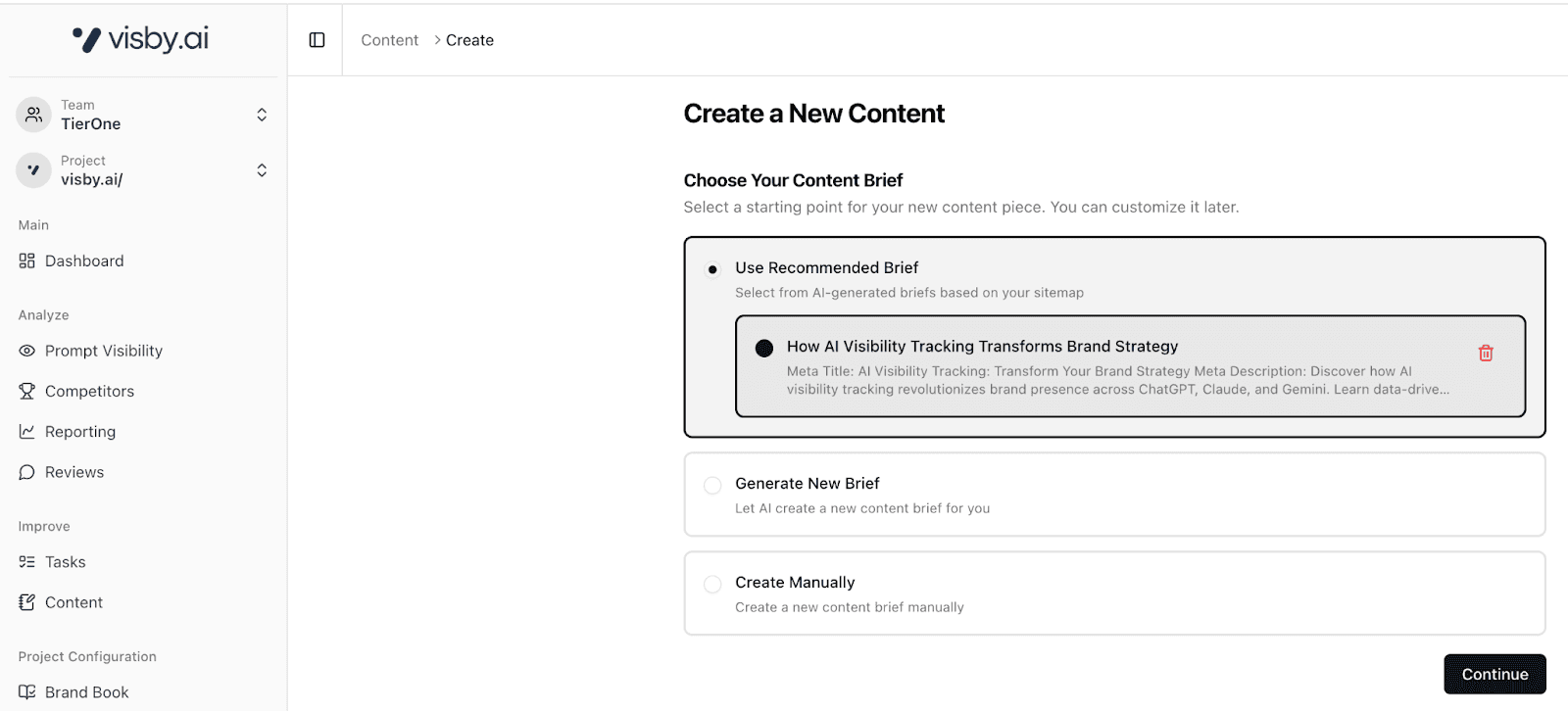 In addition, Visby AI provides automated task generation, content briefs, and reporting features that turn insights into action. Instead of relying on assumptions, you can continuously optimize your strategy with clear data, structured recommendations, and measurable AI visibility improvements.