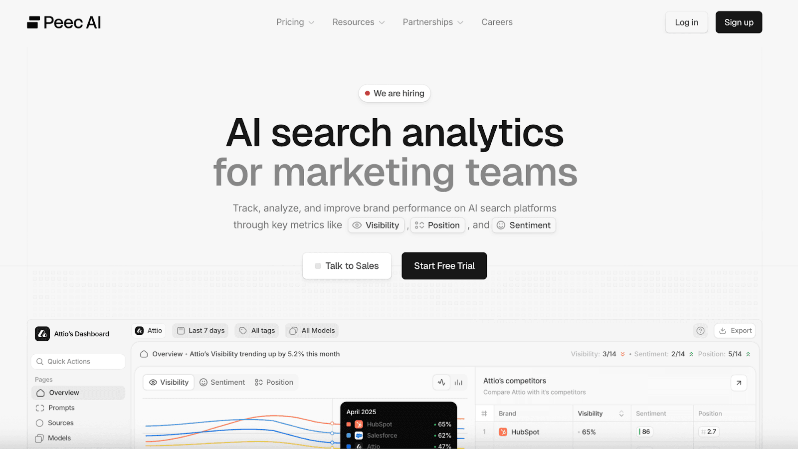 Peec AI is a lightweight AI visibility tool focused on prompt tracking and monitoring. It is designed for teams that want quick insights into how their brand appears in AI-generated answers without a complex setup.